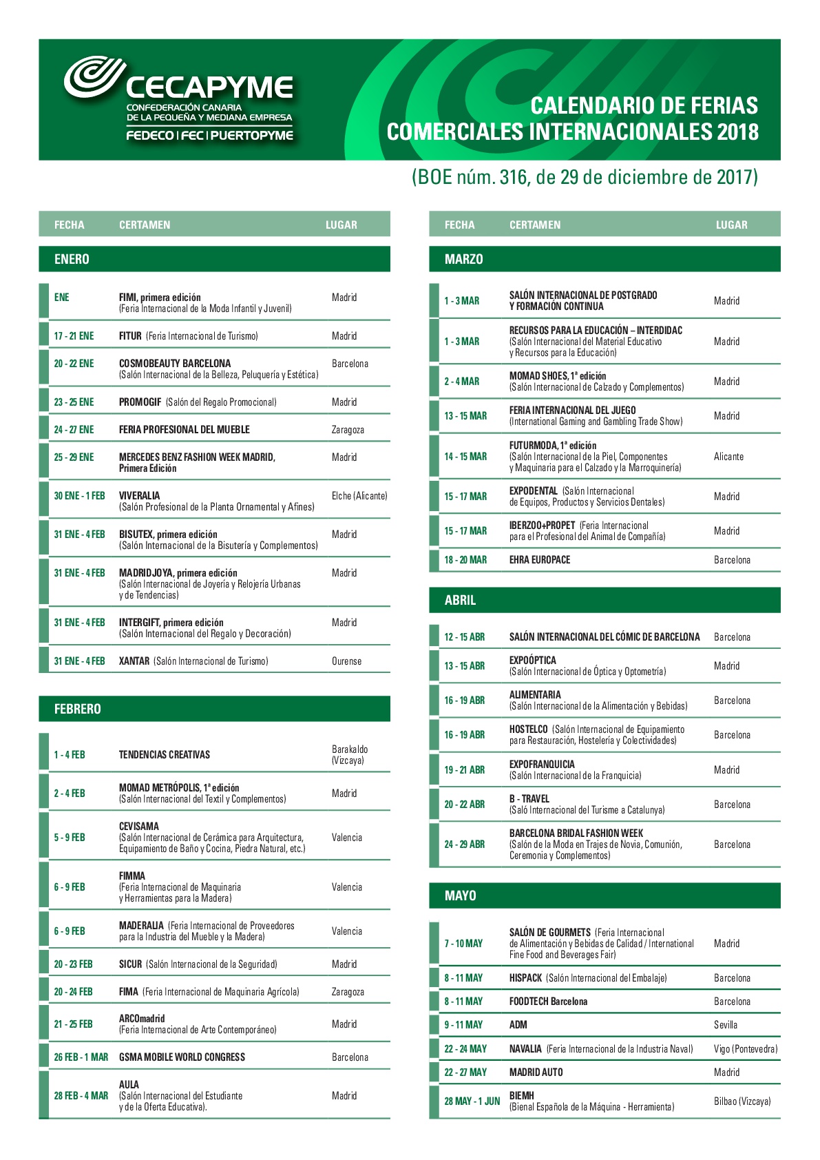 Adjuntamos el calendario de Ferias Comerciales Internacionales del año 2018.